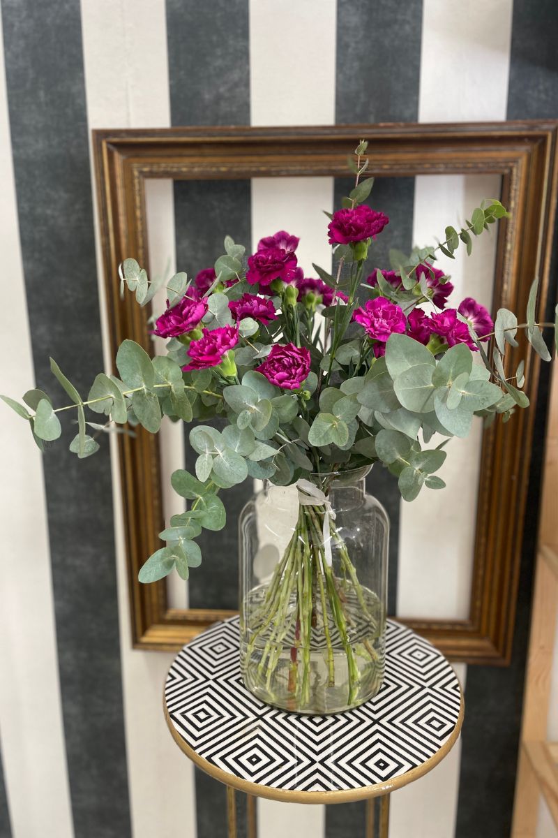 Todo un clásico, regalar flores frescas. Nuestro Ramo Ibiza está compuesto por tallos de eucalipto y clavel. Puedes escoger el tamaño del ramo, decidiendo cuántos tallos lo van a componer. Regala flores con un toque de frescura y haz que su día inolvidable.. Regala flores con un toque de estilo y haz que su día sea inolvidable. Es un detalle que le encantará y que además puedes personalizar.